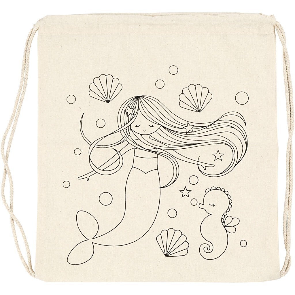 Fabric (stof) rugzak zeemeermin 37 x 41 cm 110 g/m2 licht naturel. Tas van textiel 100% katoen met decoratie aan één kant en treksluiting. Kan gedecoreerd worden met textielstiften. Merk: Creotime.