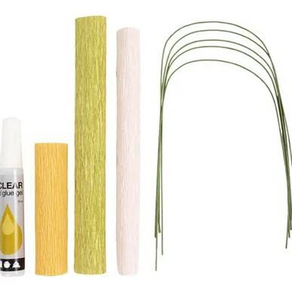 Met deze miniset maak je zelf crêpebloemen. Bevat alle materialen en instructies die je nodig hebt.