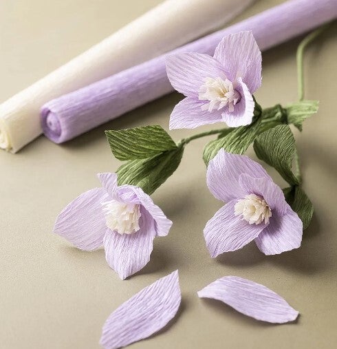 Crêpepapier pastelkleuren 8 rolletjes assorti 25 x 60 cm per rol. Crêpepapier met een crêpe-verhouding van 180% 105 grams, waardoor het perfect is voor het maken van papieren bloemen, omdat het gemakkelijk kan worden uitgerekt en gevormd. Het crêpepapier verliest zijn vorm niet nadat het is gevormd en bewerkt. Om grotere bladeren te lijmen of waar het praktisch is om de creatie direct te laten drogen, wordt een lage temperatuur lijmpistool aanbevolen, zodat het papier niet smelt. Op de achterkant van de verpakking staat een instructie voor het maken van tulpen.