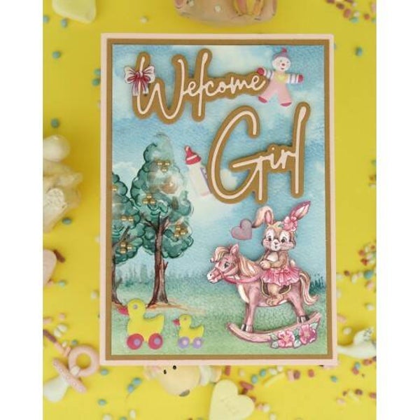 Yvonne Creations watercolor collection CD11904 Hello World Playing Bunny (spelende konijn) 3D knipvel A4. Een prachtig knipvel met konijn op hobbelpaard, konijn in de luchtballon, konijn in de hangmat en bloemen.
