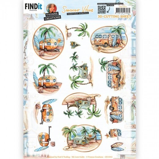 Yvonne Creations CD11913 Summer Vibes Camping watercolour collection 3D knipvel A4. Een prachtig 3D knipvel met palmbomen, strand, water, zon, caravan, tent, surfplanken, schelpen, tent en Volkswagen busje.