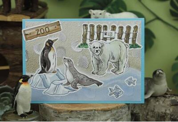 Yvonne Creations CD12032 Zoo elementen knipvel A4. Een prachtig elementen knipvel met ijsbeer, vlinder, pinguïn, ijsrots, vissen, bloemen, luiaard, bordje met zoo erop, pijl, zebra, olifant, bruine beer, tijger, toekan, emmer met stro, blaadjes en hek.