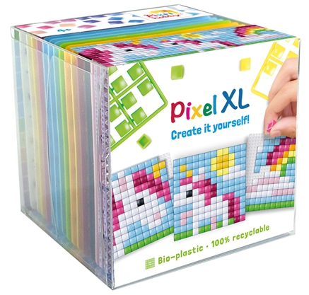 Pixelhobby Create it yourself XL kubusset 24207 eenhoorns 6,2 x 6,2 cm met 3 verschillende patronen. Geschikt vanaf 4 jaar. I'm green. Bio-plastic - 100% recyclable.