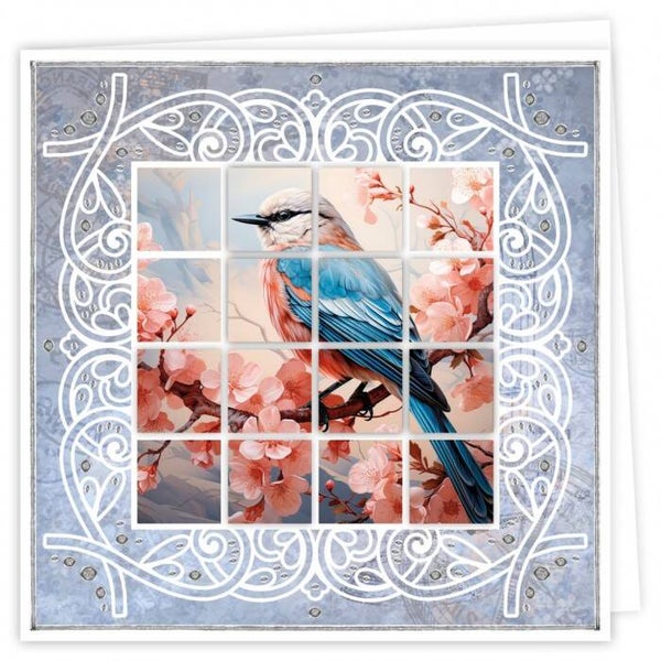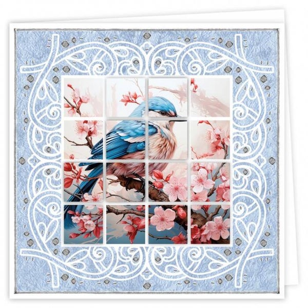 Bloxxx3 kaarten pakket Blue Birds (blauwe vogels) BLPP003. Vele Bloxxx maken samen één 3D-afbeelding. Door losse blokjes op uitgekiende plaatsen op de voorgedrukte afbeelding te plaatsen creëer je diepte op de kaart. Werk de kaart af met Shiny Details voor een extra chic resultaat. De set bevat alle benodigdheden voor het creëren van 3 vierkante kaarten. 3 voorgedrukte wenskaarten, voldoende losse Bloxxx, Shiny Details, foamblokjes en 3 enveloppen. Dankzij het voorgedrukte patroon kunnen de kaarten gemaakt worden zonder gebruik van een lichtbak.