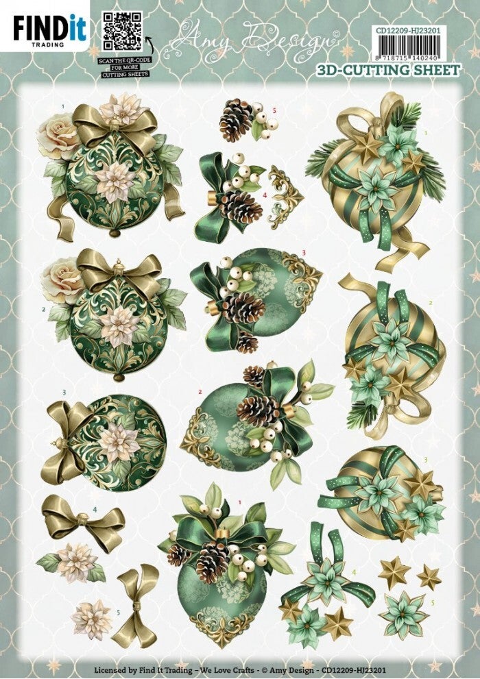 Amy Design CD12209 Enchanting Christmas (betoverende Kerst) Baubles (Kerstballen) 3D knipvel A4. Een prachtig knipvel met Kerstballen, strikken, bloemen, dennenappels, sterren, besjes en takjes.