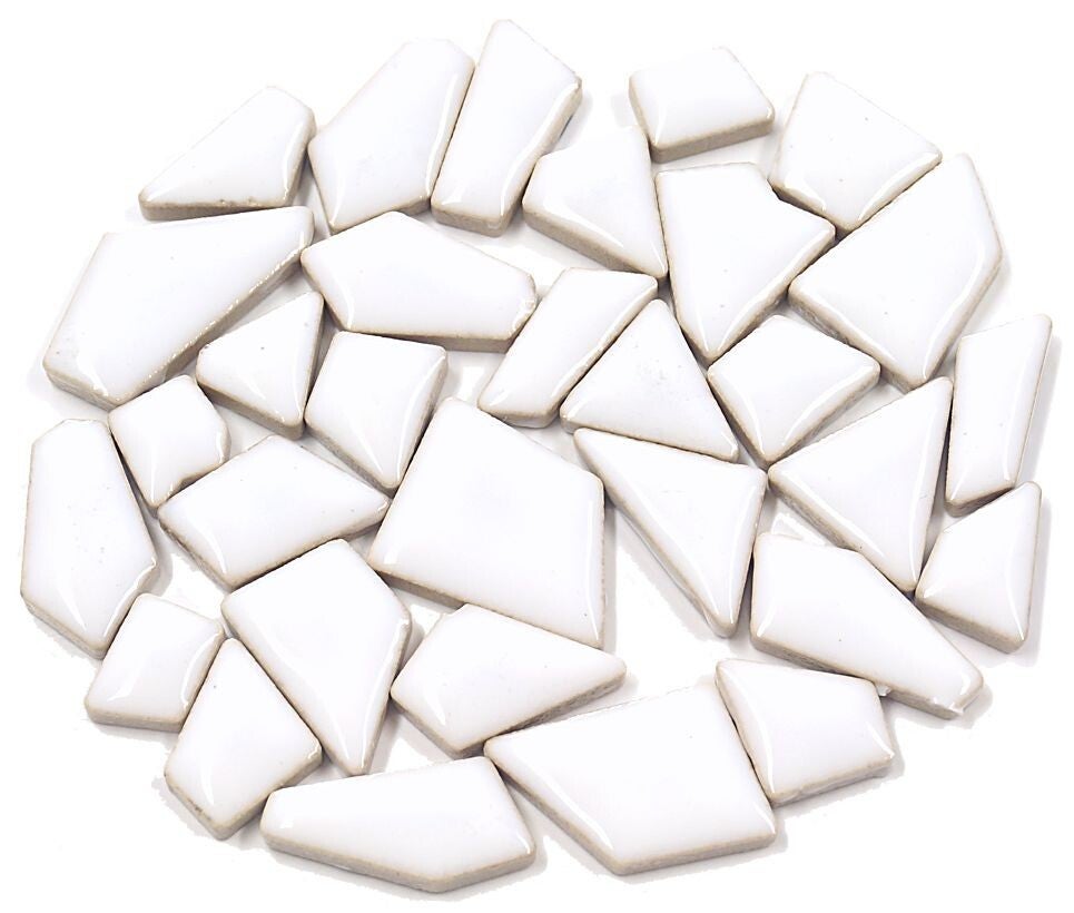 Flip keramische mix mini mozaïek à 300 gram wit. Ze zijn tussen de 5 en 15 mm groot en 4 mm dik met afgeronde randen.