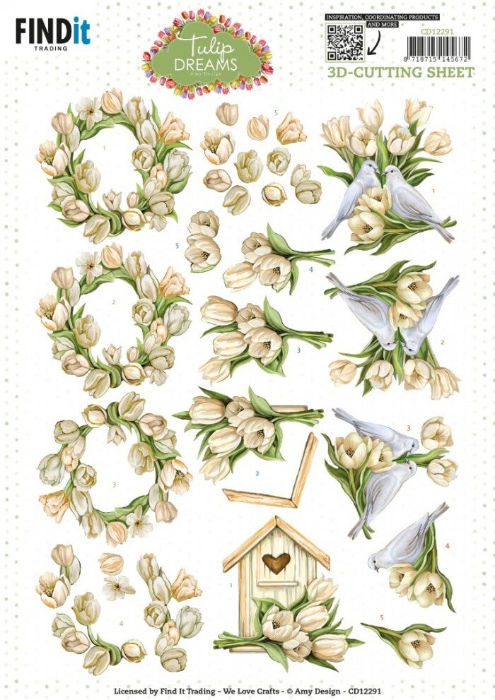 Amy Design CD12291 Tulip Dreams Romantic Tulips (romantische tulpen) 3D knipvel A4. Een prachtig knipvel met witte/zalmkleurige tulpen, vogelhuisje en witte duiven.