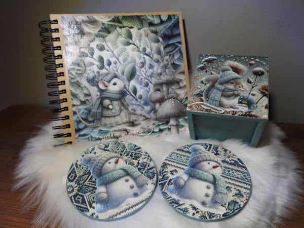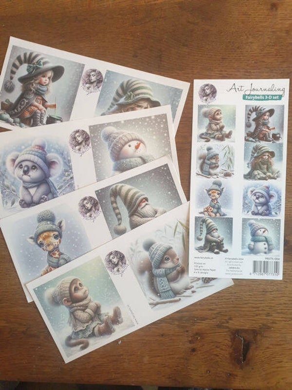 Art Journaling Fairybells 3-D set nummer 4 aap, eekhoorn, giraffe, gnoom (kabouter), meisje met kookpot, meisje, koala en een sneeuwpop in de sneeuw 99079/004. De vellen zijn 9,8 x 20,5 cm gedrukt op speciaal mat papier 120 grams. In het pakje zitten 8 verschillende plaatjes van elk 4.