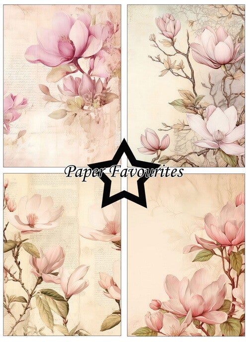 Paper Favourites A6 Pink Magnolia (roze magnolia) PFA571. De vellen zijn 10,5 x 14,8 cm enkelzijdig bedrukt papier 200 grams. Kleuren kunnen variëren. In het pakje zitten 8 verschillende vellen van elk 3. Zuur- en ligningvrij.