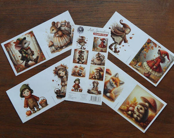Art Journaling Fairybells 3-D set nummer 11 99079/011. Art Journaling Fairybells 3-D set nummer 11 elfje met herfstblaadjes, meisje in het rood met roodborstje, man en vrouwtjes muis, vos met paddenstoel, egel onder paddenstoel, jongen en meisje 99079/011. De vellen zijn 9,8 x 20,5 cm gedrukt op speciaal mat papier 120 grams. In het pakje zitten 8 verschillende plaatjes van elk 4.
