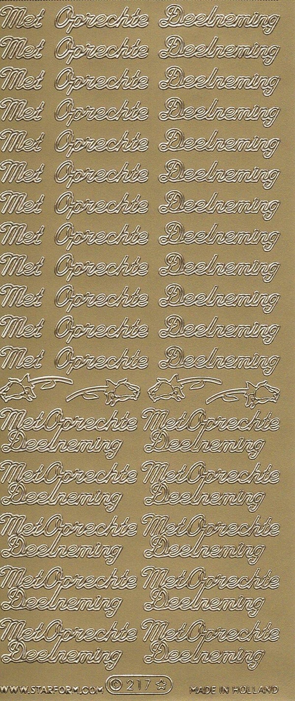 Starform 217 goud 22 x Met Oprechte Deelneming stickervel, 12 stickers 9 cm breed en 1 cm hoog, 10 stickers 4,5 cm breed en 1,5 cm hoog.