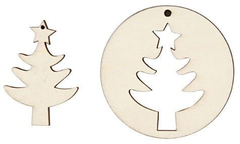 Hangende decoratie boom 2-in-1 triplex Ø 7 cm. Het is een ronde schijf van licht hout (triplex) van 4 mm dik met een losse binnenstuk in een Kerstthema, donkere rand en een oog om op te hangen. Te bewerken met Foam Clay, verf, mozaïek, decoupage enz.