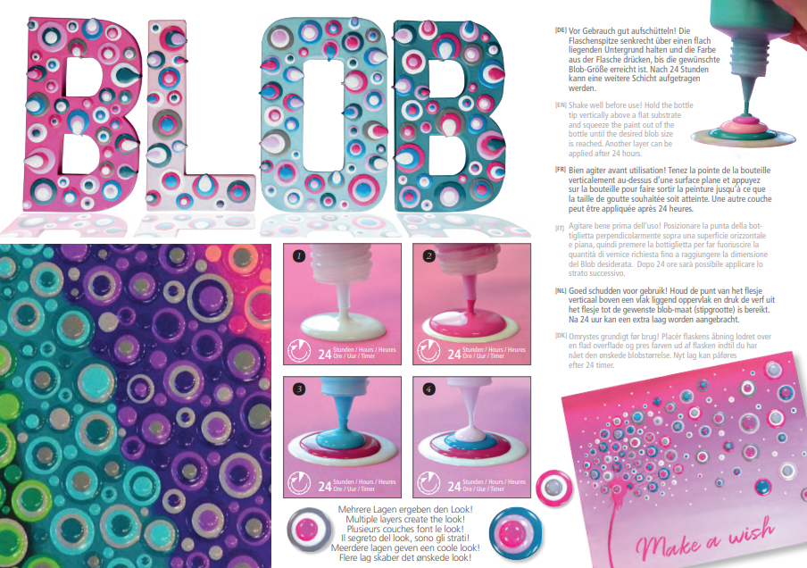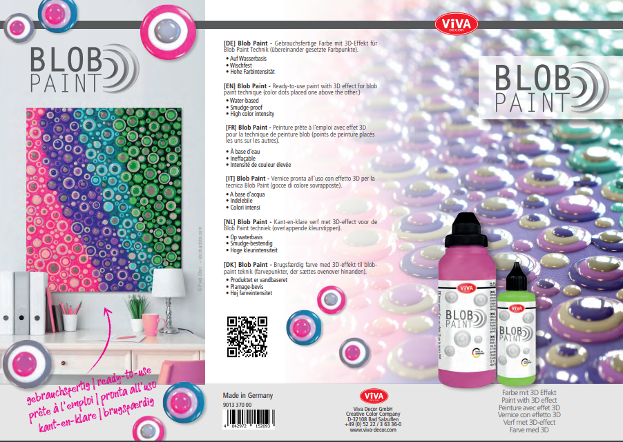 Viva Decor Blob paint (verf) Schwarz (zwart) flesje 90 ml. Kant-en-klare verf met 3D-effect voor de Blob Paint techniek (overlappende kleurstippen). Goed schudden voor gebruik! Houd de punt van het flesje verticaal boven een vlak liggend oppervlak en druk de verf uit het flesje tot de gewenste blob-maat (stip grootte) is bereikt. Na 24 uur kan een extra laag worden aangebracht. Heel vochtig weer kan invloed hebben op de droogtijd, reken een paar uur extra.Verpakking tegen vorst en hitte beschermen. Bevat C(M)IT / MIT (3:1). Kan een allergische reactie veroorzaken. Let op: rondjes tot 3 - 4 cm zijn goed te doen om deze rond te houden, bij groter opbrengen gaan ze een langwerpiger vorm krijgen.